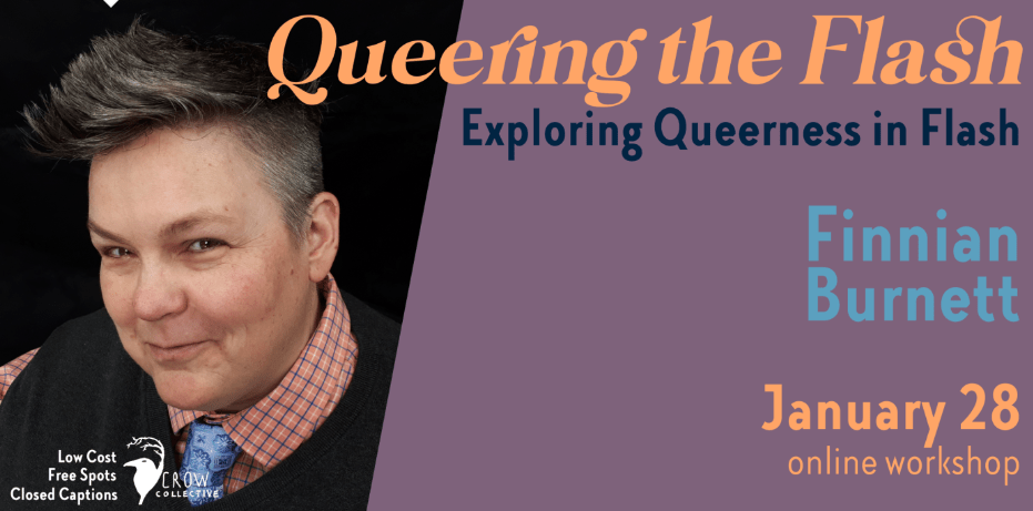 Hi All! I’m excited to announce the Crow Collective has asked me back to teach a class on “Queering the Flash.” I’ll be talking about queerness in flash fiction and how to add it to your own work. We’ll do a lot of writing, some sharing (completely optional) and hopefully learn a lot.