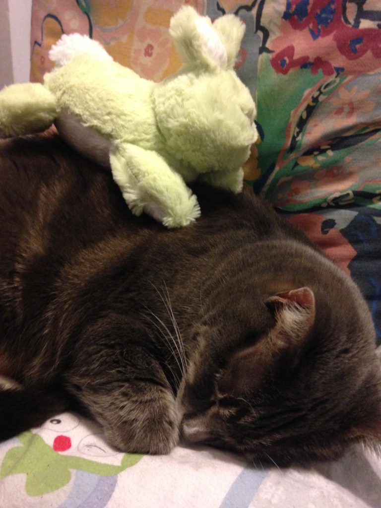 When I got to the Humane Society, I sat on the floor in the cat room and tried to get Toby’s attention. He was singularly uninterested in me, but a different cat, one named, at the time, Foster, was quite convinced I was meant to be his. He climbed into my lap and purred. I pet him for a while, then set him aside to try with Toby again. Toby, again, had no interest in me, but Foster climbed back into my lap and stared up at me with love in his bright green eyes. I put my hand on his head and he leaned into me, purring so loudly, you could have heard it across the room.
