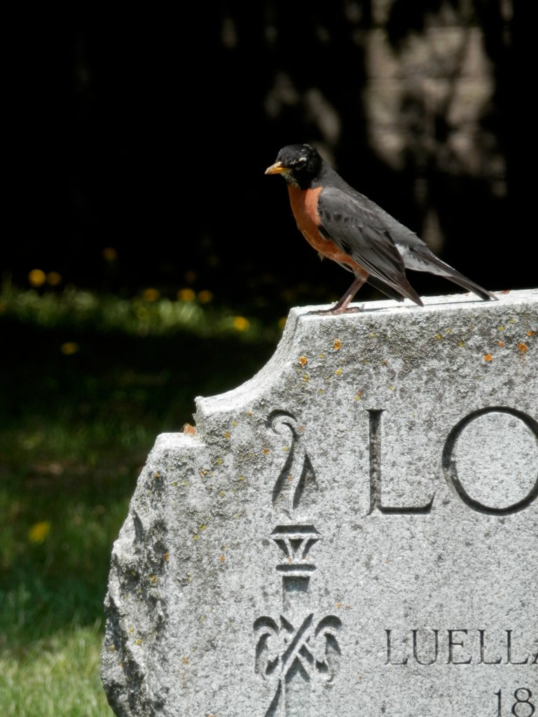 I have a picture of a robust robin perched on top of a tombstone. It has always felt like hope to me