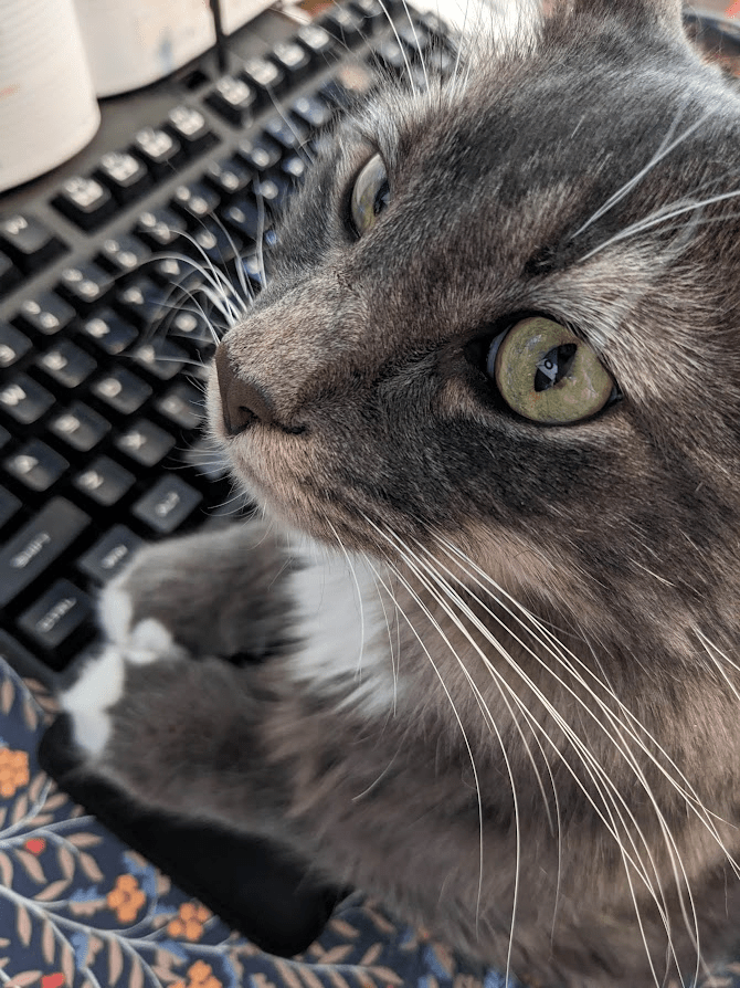 Writing OBSTACLE! Useless, useless man. Attacks my mouse, kneads my wrist rest, blocks my keyboard, sits directly on top of my notebooks, steals the lids off my pens, says “YO DE LAY HEE-HOOOOOOOOOO” at top volume when I’m on calls with editors. He does NOT show up in any of my fiction because he is a LITERARY NEMESIS.(Ed. Note. The Writing Assistant™ is dreamy, adorable, and absolutely above reproach. See photographic evidence below.)